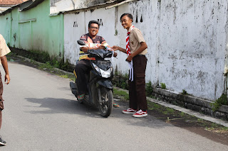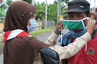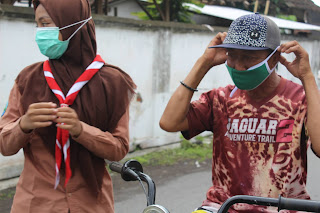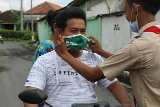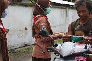 Langkah pertama adik-adik memberhentikan orang yang lalu lalang di depan gugusdepan, kalau sampai ada yang tidak memakai masker si pengendara langsung di minta untuk dari kendaraan dan dipakaikan langsung masker yang sudah di siapkan adik-adik.
